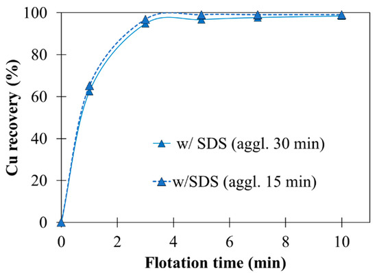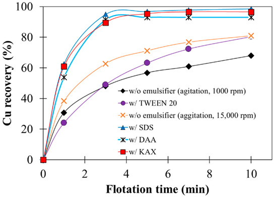 In the case of agglomeration–flotation with SDS, DAA, and KAX, Cu recovery with agglomeration using these emulsifiers was higher than that in agglomeration with intense agitation strength (15,000 rpm) without emulsifiers. These results indicate that less intense agitation strength (1000 rpm) was sufficient for agglomeration–flotation when emulsifiers were present because of the smaller droplet size and better stability of emulsified oil. This means that when emulsifiers are used, specialized equipment with high agitation strengths are not required, and the process could be easily integrated into existing flotation circuits.