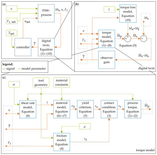 The first submodel (Figure 1b) shows the inner structure of the digital twin. The essential element is the block torque model, in which a forward calculation of the estimated process torque is conducted. Subsequently, the process torque is corrected by the torque losses resulting from friction inside the spindle motor and by the acceleration , yielding the calculated spindle torque . The error between the measured and the calculated spindle torque - is the input of the observer gain. The observer gain, similar to a controller, minimizes this error by adjusting an input signal (in this case the calculated temperature ) of the torque model. The calculated welding temperature equals the measured welding temperature T, if produces a zero-approaching torque model error -.