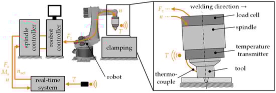 The subsystems were validated separately by welding experiments using the set-up depicted in Figure 3. After sufficient performance by the subsystem had been demonstrated, the complete control structure as shown in Figure 1a was tested. All experiments were conducted using an industrial robot (KR 500-2 MT, KUKA AG, Augsburg, Germany), equipped with an FSW spindle and a load cell for an internal control of the axial force during the welding process.