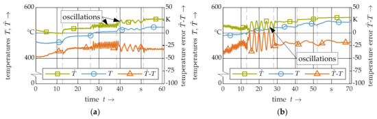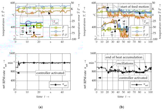 As shown in Figure 5a, the reaction of the controller resulted in an approach of the calculated temperature (green squares) to the set welding temperature (dashed horizontal line). The small temperature error was expected and resulted in a small control deviation for the measured temperature T (<10 K). With the activation of the controller after approximately 3 s, the set RPM-rate (black asterisk) dropped from 1000 min−1 to approximately 670 min−1. At the beginning, the controller experienced a small undershoot, which was brief enough to not influence the signal of the measured temperature T. This undershoot was more pronounced in experiment no. 12 (Figure 5b) and was already described in [6]. It is caused by the temperature prediction with the PT1-element of the 1 adaptive controller. The impact of the undershoot was limited by setting the RPM-rate saturation value to 400 min−1.