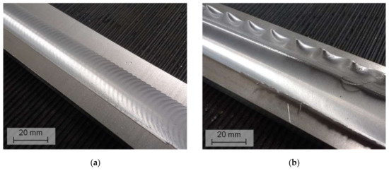 Figure 7a shows a photograph of the resulting weld from experiment no. 14. For comparison, a weld made without temperature control is depicted in Figure 7b. The comparison illustrates that the controller prevented heat accumulation and ensured a high weld quality because the weld, which was fabricated with a constant set RPM-rate, exhibited excessive flash, while with the control, no flash occurred at all. Figure 7a also shows the impact of the afore-mentioned vibrations. The weld surface features wide grooves that resulted from the visible displacement of the industrial robot and the tool during welding.
