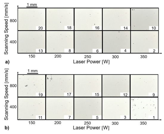 Process windows based on light microscopy (LM) micrographs with different laser focal diameters: (a) d = 60 mm and (b) d = 80 mm.