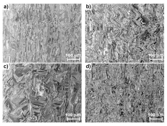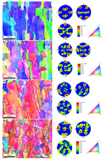 EBSD inverse pole figures in the Z-direction (IPF Z) micrographs with marked high-angle grain boundaries (over 15°) and Euler pole figures (001), (110) and (111) are shown in Figure 5. For each of the four selected samples, one primary texture component is present (Figure 5). This is different for each set of parameters and shows that the process parameters have an impact on the texture development. The highest E (sample 2, Figure 5a) resulted in a texture with a dominant shear component F, which also appeared in the texture of sample 14, only with a smaller volume fraction. The texture of sample 7 (Figure 5b), which was produced with the same E as sample 14 (Figure 5c), shows the component D to be dominant. The same recrystallized texture component, i.e., a cube, was also dominant in sample 14, with some initiations of the texture component F. For sample 20 (Figure 5d), which had the lowest E, the cube texture component was observed [20,24].