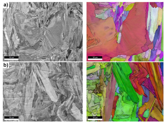 A ZEISS Axio Imager Z2m (Carl Zeiss AG, Oberkochen, Germany) was used for the Light microscopy (LM). SEM analyses were performed on a ZEISS FIB-SEM CrossBeam 550 (Carl Zeiss AG, Oberkochen, Germany) with an EDAX Hikari super EBSD Camera (Ametek Inc., Bervyn, PA, USA) The EBSD used a 70° tilt angle with an acceleration voltage of 15 kV and a probe current of 5 nA.