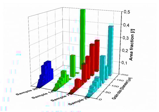Figure 8 shows a histogram of the grain size diameter of the four selected samples. Sample 2, produced with the highest E, has many very large grains: around 40% of the area has a grain size diameter of 170 µm and there are no small grains. Samples 7 and 14 have different grain size distributions, even though the same E was applied during the SLM process. Sample 14 has many small grains, but at the same time the largest number (around 50%) of the largest grains (200 µm) was observed. On the other hand, sample 7 has a smaller number of small grains, but a larger number of grains above 100 µm in diameter (approximately 85% of the total area). The low energy input creates small grains with an almost Gaussian distribution of diameters below 70 µm.