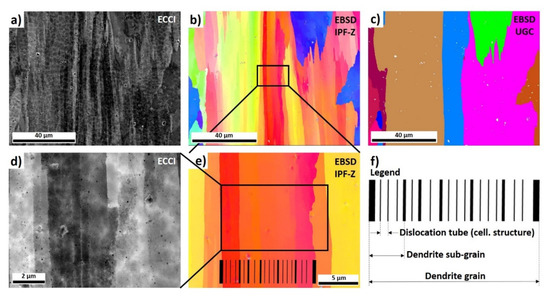 It was already reported that during rapid solidification hierarchical structures are formed [14,22]. Correlative ECCI and EBSD analyses were used to explain the hierarchical structures shown in Figure 9. Figure 9a is an ECCI image with the corresponding EBSD IPF Z image (Figure 9b) and an EBSD unique grain color (UGC) image showing separate grains, where the grain boundaries are larger than 15° (Figure 9c). Each grain consists of a few dendrite sub-grains, the orientations of which are all slightly different, as indicated by the different shades of the same color. A higher magnification (Figure 9d,e) of the same area reveals a substructure where dendrite sub-grains can correlate with the dislocation tubes. Each dendrite sub-grain consists of a few dislocation tubes. This dislocation tubes are well known cellular structures [14,22], the shape of which depend on the sample cut and are actually in most cases dislocation tubes. The solidification conditions, particularly temperature gradient and solidification velocity, define the formation of elongated cells or dislocation tubes. In the ECCI image (Figure 9d) we can observe perpendicular dislocation tubes aligned vertically. Dislocations and nano-oxides [14,22,42] define the tube walls. In Figure 9e the scheme of the hierarchical structure is overlapped with the EBSD image to explain the details. Figure 9f schematically represents each block of hierarchical structure, which is typical for AM metallic materials, and varies depending on the AM parameters. An individual dendrite sub-grain has a difference in misorientation. For instance, the observed grain in Figure 9e has the very left sub-grain (red colored) with an 8° misorientation, while the shades of the orange-colored dendrites’ sub-grains, represented by other sub-grains, have only a minor misorientation (0.5 to 3°). All these variations depend on the local conditions during the solidification.