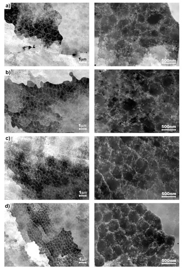 ECCI for selected AM parameters at two different magnifications 25 k and 100 k: (a) sample 2; (b) sample 7; (c) sample 14 and (d) sample 20.