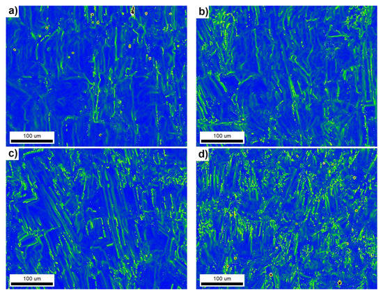 Figure 10 reveals the typical cellular microstructure of the four differently processed SLM samples from the (ECCI) images. In our case, the dislocation tubes were cut perpendicular or the cells are not elongated. The cells’ diameters are directly related to the E of the SLM process. A larger E results in a larger cell diameter. By increasing E to higher values, the solidification conditions approach those occurring in conventional casting, and therefore we can observe that the dislocation cells are increasing and would eventually vanish, and the size of the dendrites would increase.