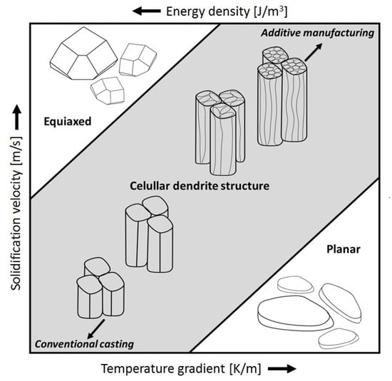 Figure 12 shows a schematic presentation of how the grain size and the shape depend on the solidification conditions. By increasing the energy density the temperature gradient is reduced [43]. At a high solidification velocity and a low temperature gradient an equiaxed grain shape is formed. A high temperature gradient and a low solidification velocity create a planar grain structure. In between, a columnar grain shape is formed (grey area in Figure 12). When we move to AM conditions, a higher solidification velocity and a larger temperature gradient, a cellular dislocation structure is also formed. The SLM parameters are in the columnar area, but by changing the parameters we can obtain an equiaxed grain structure, when isotropic material properties are preferred. By increasing both the solidification velocity and the temperature gradient the conditions are those of an SLM process, while decreasing the velocity and the gradient results in conditions that are closer to conventional casting.