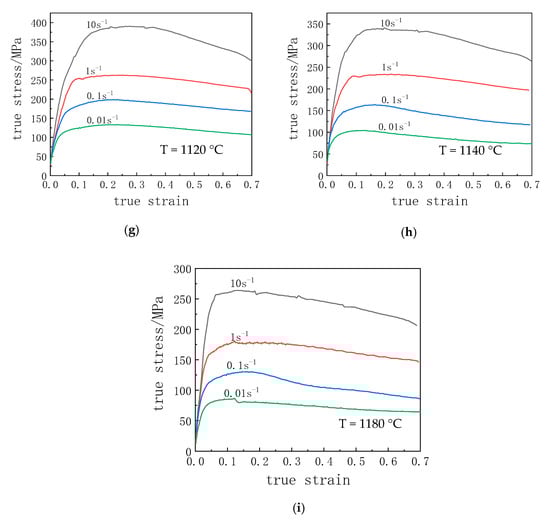 Figure 2 shows the typical flow curves of HY282 alloy at various test conditions from 960 to 1180 °C. The temperature range should be enough to get a response from the whole deformation in practice production. The curves at strain rates less than about 1 s−1 are consistent with the generally reported behavior of other nickel materials under hot deformation process. The flow stress increased rapidly to a peak value, and then gradually decreased until it reached a relatively stable state under larger strain. The reason why the curve reaches a steady state is that the interaction between work hardening and dynamic softening reaches equilibrium. This is a typical characteristic of dynamic recrystallization under hot deformation conditions []. Either at the strain rate of 10 s−1 or the temperature of 960 °C, the flow curve after peak stress showed a continuous downward trend. However, when the strain is close to 0.7, the flow stress tends to be steady after reaching its peak under other deformation conditions. Flow curve instability indicates incomplete dynamic recrystallization under low temperature and high strain rate conditions [].