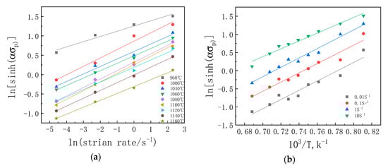 Linear relationship of (a) ln(strain rate)- ln(sinh(ασp)); (b) ln(sinh(ασp))-T.