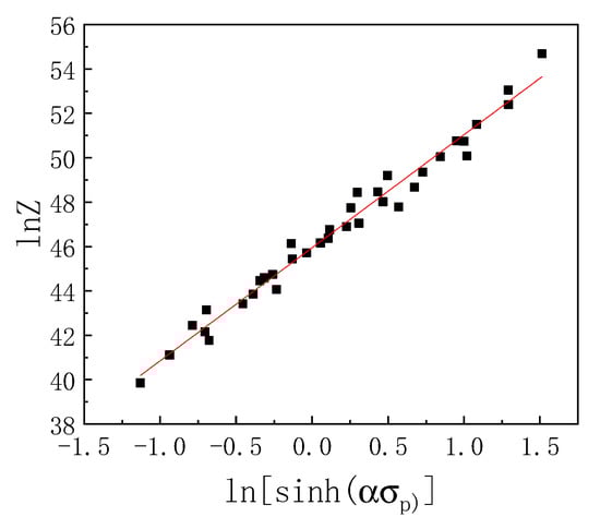 To reveal the relationship between stress and deformation conditions, the Arrhenius equation was applied to describe the relationship between temperature, strain rate, and flow stress []: