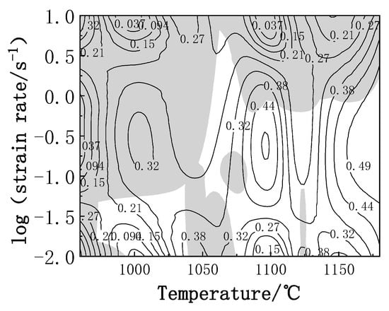 The processing maps of HY282 alloy deformed at the different strains of 0.2, 0.4, 0.6 and 0.7 are shown in Figure 6a–d, respectively. The η value is a percentage of the numerical on contours, while the shaded areas represent the flow insecurity domain. It can be seen that the power dissipation efficiency is very sensitive to strain, forming temperature and strain rate. The distribution characteristics of the power dissipation are similar, but the location and area of the shaded domains are changing continuously with strain. Obviously, no matter how much true strain is, there is always a flow instability domain located at the temperature of 960–1050 °C and a strain rate of 1–10 s−1. A void formed inside the alloy when it was deformed at low temperature and high strain rate regions, and many dislocations were accumulated around the solute atoms. Then, the stress field immediately generated by the high dislocation density caused the interfacial lattice distortion, resulting in stress concentration. Moreover, the dislocation pile-up could not be mutually canceled by dislocation climb and cross-slip in time, which further caused the interfacial lattice distortion. When the stress intensity exceeds the alloy strength, recrystallization cracks will occur, causing the alloy to fracture []. It is also reported that the instability of the matrix is related to the incompletely recrystallized structure, and the non-uniformly deformed structure easily becomes the site of defect initiation [].
