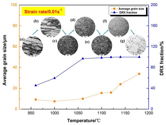 Figure 8, Figure 9, Figure 10 and Figure 11 shows a schematic diagram of grain size, DRX fraction and optical microstructure of the specimens deformed at the strain rate of 10 s−1, 1 s−1, 0.1 s−1 and 0.01 s−1. It was clearly seen that the grain microstructures were greatly dependent on deformation temperature. The DRX fraction increased with the increase of temperature at any strain rate, and reached complete recrystallization with a DRX fraction over 95% at 1100 °C. This is because the enhanced atomic thermal vibration and diffusion increase the nucleation rate of DRX. After reaching complete recrystallization, the average grain size increased continuously as the DRX grain grew with the increase of temperature. At 960 °C or 1000 °C (as shown in Figure 8 and Figure 9a,b), the microstructures present elongated grains and deformation concentration zones. Deformation at low temperatures is prone to large stress concentrations due to less slip system so that the formation process of twins in dynamic recovery (DRV) promotes the nucleation of the sub-grain, and the “necklace” type recrystallized structure (as indicated by the red line) is formed due to the inconsistent growth of the sub-grain [,]. Additionally, DRX can be triggered by sub-grain crystallographic misorientation and low angle grain boundaries during hot deformation []. Meanwhile, since the adiabatic heat generated during the thermal deformation process does not have enough time to transfer due to the high strain rate of 10 s−1, bands of flow localization are prone to occur []. While the deformation temperature increased, the mobility of grain boundary was enhanced, leading to the increasing rate of grain boundaries migration []. So, the DRX grains can easily grow up under high deformation temperatures like 1180 °C, as shown in Figure 8, Figure 9 and Figure 10 and Figure 11f,g.