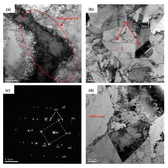 In this section, more details of hot deformation behaviors and softening mechanisms will be discussed. Figure 13 showed the dislocation substructures of HY282 alloy in the deformed specimens under the strain rate of 1 s−1. Obviously, the dislocation substructures were significantly affected by the deformation temperature. At 960 °C, the dislocation cell formed by large rough tangles of dislocations is observed. With the deformation temperature increasing, rearrangement or adjustment of dislocations, dislocation slip, and mutual cancellation occurred in the alloy, resulting in the appearance of sub-grain as shown in the circle of Figure 13b. The twins were also represented within the sub-grain, and the selected area diffraction patterns (SAED) were as shown in Figure 13c. The diffraction pattern was formed by two sets of single crystal electron diffraction spots with different zones. The twin spots do not coincide with the basic spots and appear at 1/3 of a certain spot on the matrix, which is a typical feature of face-centered cubic twin diffraction patterns. It is reported that the formation of twins promotes recrystallization [,].