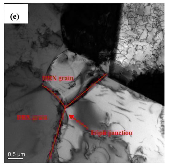 Recrystallization nucleus indicated the occurrence of DRX while grain boundary bulging and fluctuation suggested that the recrystallization mechanisms were discontinuous dynamic recrystallization by strain-induced grain boundary migration nucleation []. Due to the non-uniform deformation, the local storage energy on both sides of the original high angle boundary may be different, i.e., the dislocation density was different. Therefore, in Figure 14d, the region having a low dislocation density grew into an adjacent grain having a relatively high dislocation density to form a tongue. The tongue has almost no strain hardening, and this bulging subgrain will become the discontinuous dynamic recrystallization nucleus, which was the mechanism of grain boundary migration nucleation. The grain boundary of the DRX grain was bulging in Figure 14e, which was a typical characteristic of grain boundary migration, and eventually promoted the grain growth.