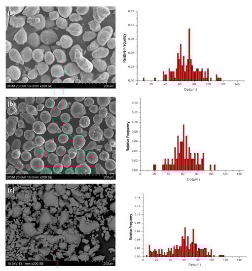 The Al-12Si alloy particles had a spherical shape with few satellites (Figure 1b). The size distribution of the Al-12Si alloy differed from that provided by the manufacturer by 13.4% (+40–90 μm).