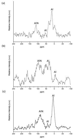NMR analysis of laser-treated powders is shown in Figure 2. In all three cases, the peaks corresponding to cubic Al were identified. Apart from this peak, another peak was observed in all the samples at 112 ppm; this value corresponds to hexagonal AlN, and it has been assigned by Xiong et al. [] to the tetrahedrally coordinated AlN4 units.