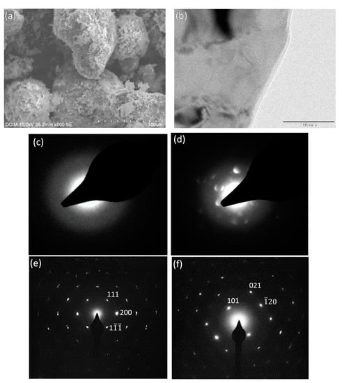 SEM and TEM images of pure Al powders (Figure 3) showed changes in the morphology of the particles surface after the laser treatment. The powder was slightly deformed due to melting and solidification (Figure 3a), but the general shape of the particles had not changed. Figure 3b shows a detail of a laser-treated Al particle in which reaction products were formed at the surface of the aluminium particle. Electron diffraction patterns taken in different zones of this layer showed that there were amorphous zones (Figure 3c) and nanocrystalline zones (Figure 3d). SAED patterns indicate the existence of AlN with different crystalline structures: Figure 3e shows a zone in which the SAED pattern corresponds with an AlN cubic structure (F-43m) oriented on the zone axis [], and Figure 3f shows a SAED pattern that correlates with hexagonal AlN (P-63mc) on the zone axis [010].