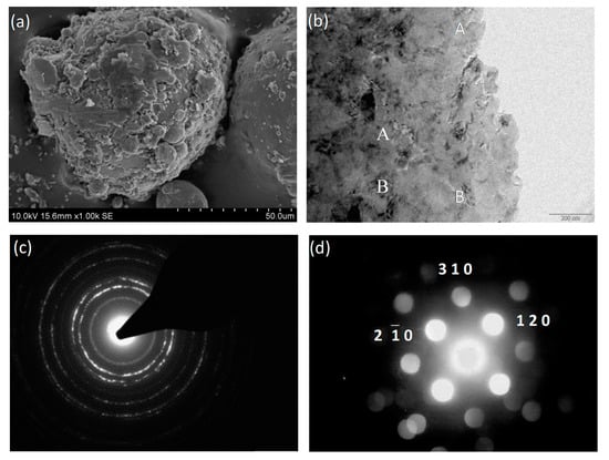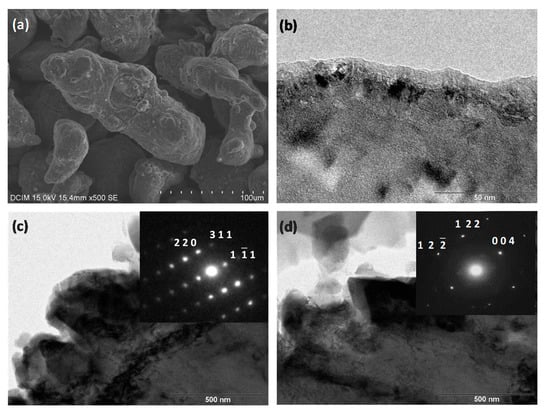 The Al-12Si/AlN laser-treated powder did not change its overall shape, although some deformation and roughness appeared on its surface (Figure 4a). Figure 4b shows the TEM image of the surface of an Al-12Si/AlN particle in which zones with different characteristics were observed. The diffraction pattern on the particle surface showed the presence of AlN that varied from partially nanocrystalline in Zone A (Figure 4c) to cubic (F43m) in Zone B (Figure 4d; the pattern is correlated with zone axis [0 0 1]).