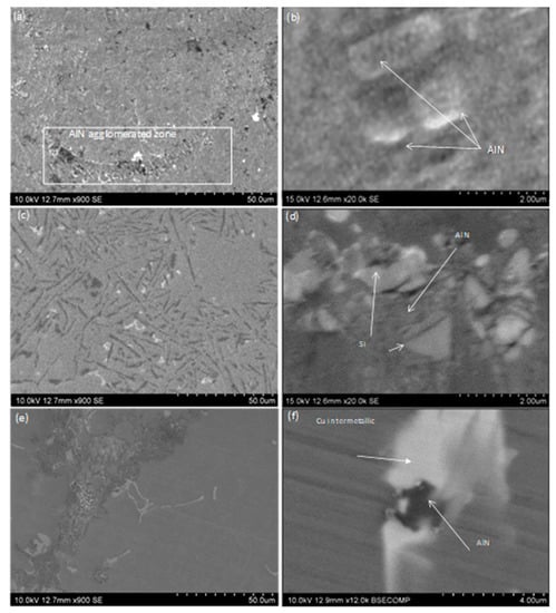 The Al-12Si/AlN microstructure shown in Figure 6c consists of an aluminium–eutectic silicon matrix reinforced with AlN particles. The AlN size was below 1 µm (Figure 6d), and the distribution of particles was more homogeneous than in the case of using a pure Al matrix. Figure 6e shows the microstructure of the AA6061/AlN composite; in this case, apart from AlN particles, Cu intermetallic was also observed. The AlN aggregates’ average size was 1 µm, as observed by SEM, and many particles were observed near the Cu-intermetallic precipitates (Figure 6f).