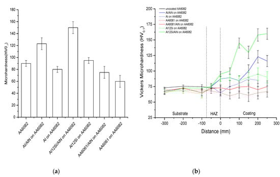 Figure 7a shows the average Vickers microhardness of the different coatings and of the substrate. In all cases, the microhardness was lower in the unreinforced coatings. As a reference, the hardness of the substrate was 90 ± 5 HV0.1; this value is common in this alloy, and it is due to the alloying elements of the AA6082 and to the formation of Cu precipitates in the AA6082. The hardness of the unreinforced Al layer was 80 ± 5 HV0.1, which is lower than that of the substrate. The incorporation of in situ formed AlN particles increased the hardness by 65% to 123 ± 10 HV0.1. In the case of the Al-12Si alloy, the unreinforced coating microhardness was 95 ± 5 HV0.1, which is similar to the substrate hardness. In this case, the incorporation of the AlN reinforcement increased the hardness by more than 35% to 150 ± 10 HV0.1, which is a very high hardness value for Al composites. Finally, the unreinforced AA6061 layers had a hardness of 60 ± 10 HV0.1, which increased by 20% to 75 ± 10 HV0.1 by forming the AlN particles in the alloy.
