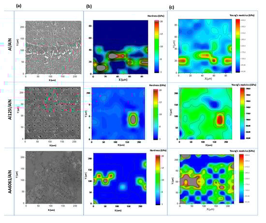 (a) Al/AlN, Al-12Si/AlN, and AA6061/AlN microstructure; (b) Al/AlN, Al-12Si/AlN, and AA6061/AlN hardness map on the zone shown in a); (c) Al/AlN, Al-12Si/AlN, and AA6061/AlN Young’s modulus map on the zone shown in a).