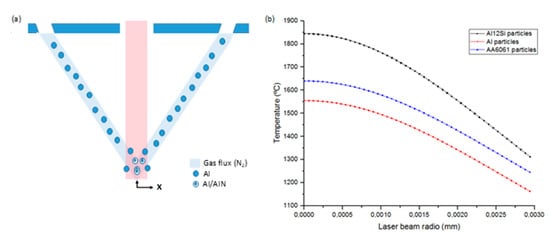 The model was implemented using Matlab 7.0 software and the diagram of the coaxial laser deposition nozzle used, and the powder and gas flux are shown in Figure 8a. The temperature distribution of the sprayed particles during the fabrication process at the focal plane is plotted in Figure 9b for the different powders used.
