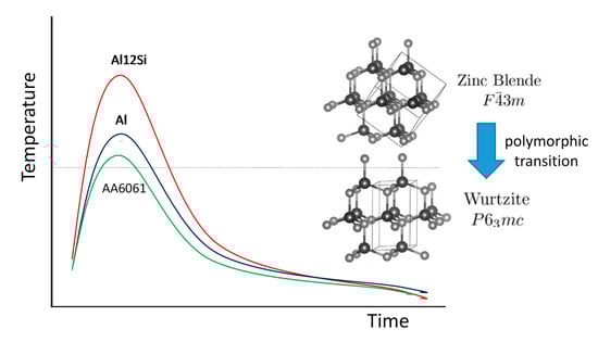 Figure 10 shows schematically the process described above, and the temperature evolution of the particles is represented. Al-12Si particles have a higher cooling speed than pure Al and AA6061 particles, and this lower cooling speed allows the polymorphic transition from cubic to hexagonal AlN.