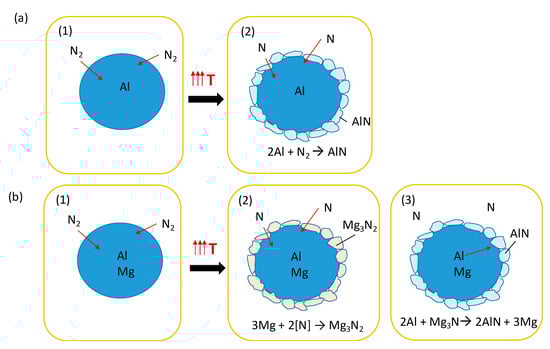 In the Al-12Si particles, the presence of Si does not catalyse the formation of AlN, so there is a direct reaction between Al and N following the mechanism shown in Equation (1). In this case, only the cubic AlN phase was formed (Figure 4). Apart from the higher temperature of the powder, this can be due to the presence of silicon, which reduces the AlN reaction speed, as it has been described in this kind of system []. Figure 11a shows schematically the reaction mechanism described above for Al and Al-12Si particle nitridation. The higher temperatures achieved dissociates the diatomic nitrogen, which reacts with molten aluminium particles, forming AlN nanoparticles on the aluminium surface by direct nitridation.
