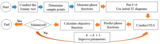 Figure 1 presents a conceptual procedure of the methodology for optimizing IT diagrams. First, information about phase fractions at some sample points, called target phase fractions, is obtained on a planar cross-section of the Jominy test sample. The target points are shared with the control points for finite-element predictions and IT diagram optimization. The measured fraction of jth phase at the ith sample point is applied as its associated target value, , in the following objective function to be minimized [18]: