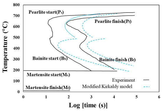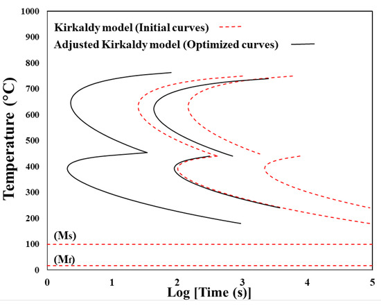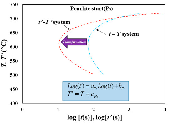 where and are the temperature and time in the untransformed system, respectively, which define the domain in which to express the Kirkaldy model. The parameters and are the temperature and time after applying the transforming equations, respectively, and represent the adjusted curves shown in Figure 2. The constants a, b and c are the adjustment parameters, i.e., the so-called design parameters in the optimization problem, which are used to optimally adjust the theoretical IT diagram. Note that adjustment parameters are obtained for each curve in the IT diagram. For example, the parameters for the pearlite start curve are , and (Figure 3). Therefore, the total number of design parameters for each phase in the optimization is six, including the adjustment parameters of the start and finish curves.