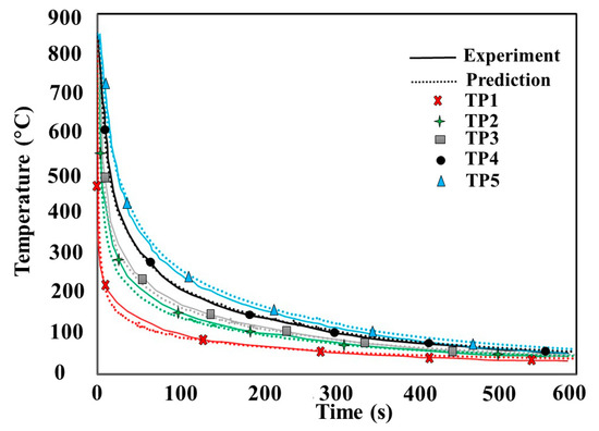 where and are the predicted and experimental temperatures at the ith sample point and jth sampled time during cooling, respectively. The parameters n and m are the number of sample points (1 to 5 in Figure 4) and sampled times, respectively. The experimental temperatures and their corresponding predictions obtained using the optimized values (Table 3) are in good agreement (Figure 5). The maximum difference between the measured and predicted temperatures is about 50 °C at sample points 1 and 2. This error is calculated at temperatures below 300 °C where diffusional phase transformations are not fast enough to influence on the phase fractions.