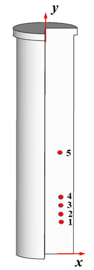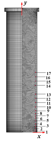 The cylindrical and top surfaces of the specimen, i.e., the free surfaces, are subjected to natural convection and radiation. Heat loss through these free surfaces is analyzed by considering both convection and radiation. The radiation heat transfer from the free surfaces is calculated using the Stefan–Boltzmann law with a radiation emissivity of 0.7 [24]. The convective heat transfer on the surfaces is described by Newton’s law of cooling [24,25]: