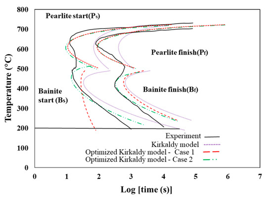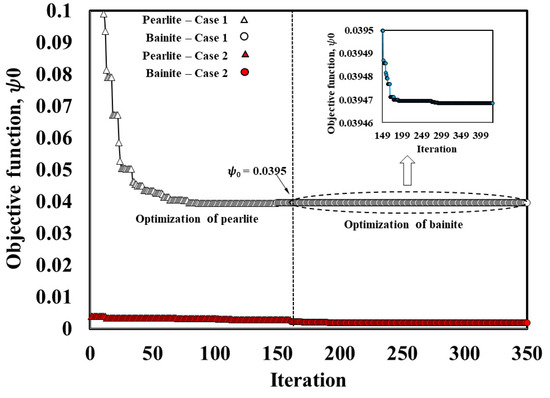 where a includes , , and ; b includes , , and ; and c includes , , and . The initial guesses used are and for every phase. These initial guesses provide the same IT diagram with the modified Kirkaldy model for the medium and high alloy steels [5] and the diagram approaches the experimental one through optimization, i.e., minimization of the objective function defined in Equation (1). Two optimizations using different weighting factors, values, were performed as shown in Table 5. In Case 1, the same weighting factors were applied to all phases of Equation (1). In Case 2, the weighting factors were allocated unequally in terms of the average phase fractions shown in Table 4; more significance was assigned to phases present in smaller fractions, such as bainite and austenite. In both cases, optimizations were carried out independently for pearlite and bainite. As shown in Figure 7, after about 350 iterations, the objective function values of Cases 1 and 2 converged to 0.039 and 0.001, respectively. Table 6 lists the optimized adjustment parameters for both cases. Figure 7 shows that for Case 1, the reduction of the objective function values for the bainite curves is quite small compared with those of the pearlite, indicating that optimization cannot adjust the bainite curves appropriately. In contrast, the value of the objective function is reduced during both the pearlite and bainite optimizations of Case 2, where weighting factors are applied.