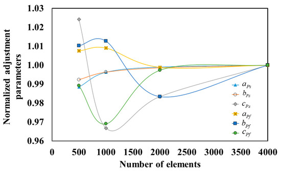 To investigate the effect of number of elements on the optimized adjustment parameters, optimizations of pearlite curves (Case 2) were conducted with four finite element models of 500, 1000, 2000 and 4000 elements. The effect of the number of elements on the normalized adjustment parameters for pearlite curves with respect to the 4000-element model is shown in Figure 8. As depicted, by increasing the number of elements, the results become more reliable and the dispersion of optimized values decreases. However, the optimized values are less scattered when the number of elements is greater than 2000. The larger the number of elements, the longer is the optimization time. Therefore, a sufficient number of elements that is 2000 used not only to save the time but also to achieve a reliable result.