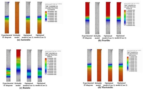 Figure 10 illustrates the distribution of austenite, pearlite, bainite, and martensite fractions predicted using the experimental IT diagrams, Kirkaldy model, and optimized IT diagrams using both optimizations. The same finite-element model given in Section 3 was applied for all simulations, and only the IT diagrams used in the simulations are different. Figure 10 clearly shows qualitative improvements in predictions with the optimized adjustment parameters. The distribution of the predicted phase fractions of all phases is similar to that predicted using the experimental IT diagrams. However, the maximum predicted bainite fractions are 2.0 vol%, 1.1 vol% and 1.8 vol% (Figure 10c) in the experimental IT diagrams and optimization Cases 1 and 2, respectively. The distribution of the bainite fraction in Case 2 is in adequate agreement with the predicted distribution using experimental IT diagrams. Note that the predictions of the Kirkaldy model are in very poor agreement with the predictions of the experimental IT diagrams.
