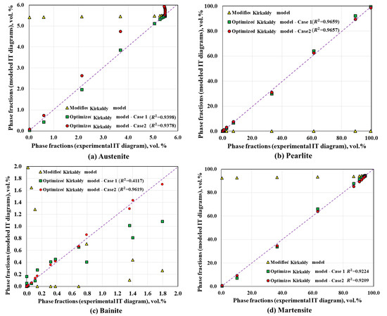 Figure 11 quantitatively compares the phase fractions predicted using the experimental IT diagrams with those of the original and optimized Kirkaldy models. The R-squared values of the austenite, pearlite and martensite phases predicted by Case 1 of the optimized Kirkaldy model are 0.94, 0.97 and 0.92, respectively, indicating that the error between the experimental data and the optimized Kirkaldy model (Case 1) is negligible. The R-squared value for the bainite phase is 0.41, which is very far from 1.0. However, the data points for the bainite fractions predicted by the Case 1 are less scattered in Figure 11c compared with the Kirkaldy model. By applying the optimized Kirkaldy model of Case 2, the R-squared values for austenite, pearlite, bainite and martensite improve to 0.94, 0.97, 0.96 and 0.92, respectively.