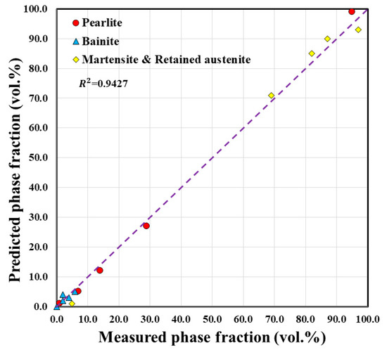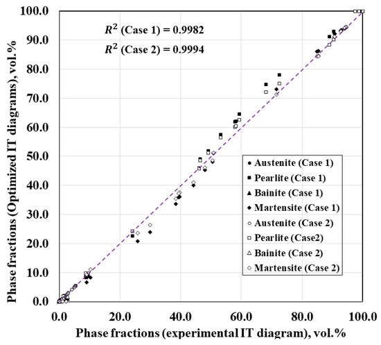 To thoroughly evaluate the optimized models, the phase fractions are predicted at 40 sample points distributed uniformly on the plane section of the Jominy test specimen. Note that these sample points are not identical to the sample points used in the optimization for training the model (Table 4). Therefore, they can be used to evaluate the reliability of the model. Figure 12 shows that the average R-squared values are 0.9982 and 0.9994 for Cases 1 and 2, respectively. Both are very close to 1.0, demonstrating that the optimized models can predict the phase fractions of all phases with high confidence. However, the IT diagrams of Case 2 lie closer to the experimental IT diagrams than do those of Case 1, indicating that the optimized model of Case 2 better predicts the fractions of all phases, even those of phases with small fractions (such as bainite). In other words, optimization using an objective function balanced with weighting factors reliably predicts the phase fractions not only of the Jominy test (where the bainite and austenite fractions are small), but also of other heat treatment processes.