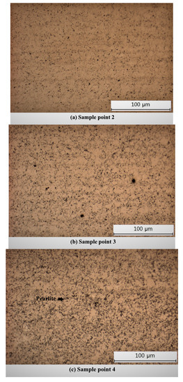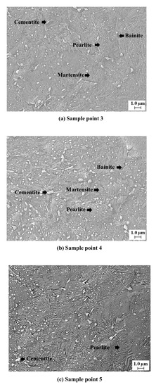 The bainite and martensite fractions were measured via scanning electron microscopy (SEM) and image analysis. Figure 15 shows the SEM images of some sample points; the calculated bainite and martensite fractions are listed in Table 8. The microstructure features pearlite, bainite and martensite at sample points 3 and 4 but is almost entirely pearlite at sample point 5.