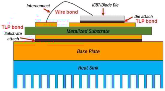 Due to rapid progress in power electronics and packaging devices, there is a strong demand for better joining materials and processes. However, conventional silicon power module devices are now being replaced with high power ceramic modules made of SiC or AlN packages, which have better thermal stability at higher temperatures []. Thinner die packages combined with high speed and density require new packaging materials to support the device applications []. The power module is an essential component of power electronics for performing power conversion and supply or switching supply while maintaining stability and efficiency []. All power modules are used in inverter or converter circuits of on-board devices, but their types vary depending on the circuit configuration and the specifications of the modules []. The popular insulated gate bipolar transistor (IGBT) power module package used for power conversion is shown in Figure 1. It consists of several components, e.g., heat sink, base plate, and direct bonded copper (DBC) substrate with attachment material [,,]. The top side of the module has wire-bonded elements connected to an IGBT diode and the external lead frames. The IGBT is bonded to the DBC with die attachments, as shown in Figure 1. The IGBT module is generally encapsulated with multiple diodes, metal-oxide field-effect transistors (MOSFETs), and intelligent power modules (IPMs) for the surface protection of wire bonds from the external atmosphere. These power semiconductors are generally bonded with a die attach material or soldered to the DBC substrate for electrical and thermal contact and insulation when necessary. In modern versions of power modules, the IPM mounts a dedicated circuit for drawing maximum power from the IGBT and minimizing electromagnetic shielding effect for the protection of the entire device.