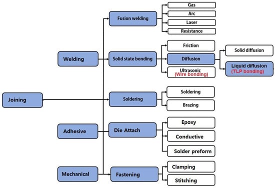 There are many different types of joining processes. According to the established research, classification of joining processes can be summarized as shown in Figure 2 [,]. Different joining processes are divided into fusion welding, solid-state bonding, and soldering. In fusion welding, both the parent metal and filler melt into the weld joint. In solid-state bonding, however, both base metal and insert metal do not melt in the process []. Moreover, in brazing, only the filler metal melts but the base metal remains as a solid.