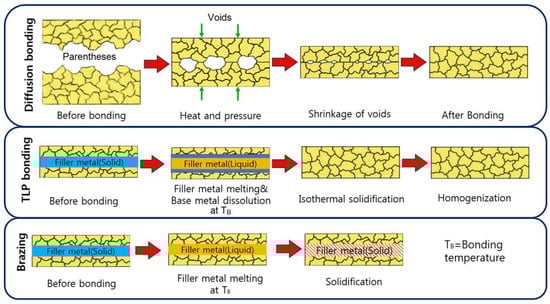 Schematics of diffusion bonding, TLP, and brazing processes.