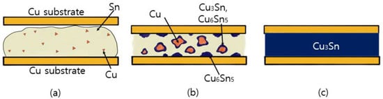 The TLP bonding method based on Sn-based alloy or solder mainly used in the electronics industry manly uses various Sn-based solders such as Sn-Cu, Sn-Ni, or Sn-Ag as a bonding material, and if necessary, other metal powders such as Cu can be added to it. However, the formation of brittle intermetallic compounds (IMCs) during joining suppresses the concept of isothermal solidification due to the decrease in concentration caused by the diffusion of low melting point elements toward the base material [,]. This is because Sn and Cu, Ni, Ag, and the like in the bonding material react with each other to form the IMCs in the entire joint, thereby increasing the high-temperature strength of the joint [].