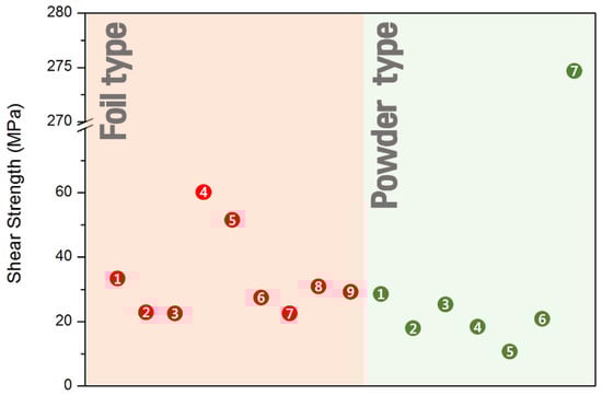 A summary of the shear bond strength after foil and powder type TLP bonding is given in Figure 7. The various bonding specimens and conditions are indicated in Table 2. The bonding temperature, bonding time, and bonding strength of an important specimen are specified.