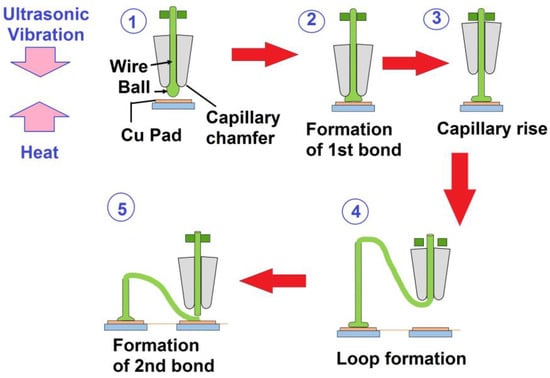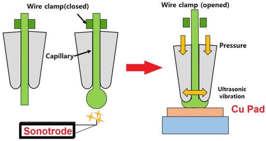 The schematic for ball bonding or crescent bonding is shown in Figure 9. The authors reported the bonding mechanism in wire bonds, and they found that increasing the ultrasonic output during wire bonding caused a micro slip in the ball area pressed to the electrode pad on the chip if the output was low [,].