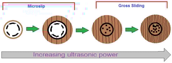 The bonding mechanism consists of three stages, namely friction, approach, and interdiffusion, between a wire and a pad on the substrate [,]. As the ultrasonic power increases, the fine slip generally changes to microslip, gross sliding, and final bonding, as shown in Figure 10.