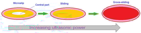 Lum et al. [] suggested the ultrasonic bonding model of wedge bonding using an Al wire. They found that at low ultrasonic power (130 mW), microslip became concentrated at the peripheral region but did not reach the center of the footprint (Figure 12). In addition, at higher ultrasonic power (195 mW), gross-slide occurred, and the bonded areas reached the central part of the footprint entirely. By increasing the bonding power further to 260 mW, the bonding density was over-increased, and destruction of the oxide layer occurred.