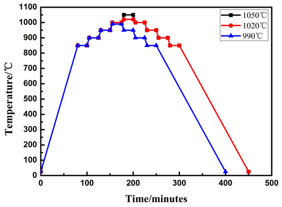 The coatings were annealed at 990, 1020 and 1050 °C for 20 min with a stepped heating process when the temperature was higher than 850 °C within a vacuum environment, as shown in Figure 2. The pressure during the vacuum annealing was kept at 10−1 Pa. The residual oxygen partial pressure was about 2.1 × 10−2 Pa. The main aim in adopting vacuum annealing was to avoid oxidation and decarburization of compacted graphite iron. The annealing temperature was chosen according to the nickel-based powder exothermal peak at about 1040 °C through differential scanning calorimetry (DSC) analysis provided by Chengdu Quanxin New Materials Co., Ltd. The accuracy of furnace temperature was calibrated to plus or minus three degrees, which would ensure the actual accuracy of vacuum annealing temperature.