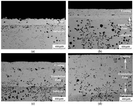 The cross-sectional microstructures of the as-sprayed and annealed coatings are shown in Figure 4. After annealing, the interlayer discontinuity between coatings and compacted graphite iron substrate disappeared. Meanwhile, a translation zone formed. Furthermore, the translation zone grew mainly towards the compacted graphite iron. In contrast, the translation zone was brighter than the nickel-based coating, which is commonly known as diffusion transfer bright (DTB) [34,36]. The translation zone is often considered as a feature of metallurgical bonding [34,36]. The top surface of the nickel-based coating became smooth, which seemed like the coatings’ surfaces re-melted through oxyacetylene flame, as compared to the as-sprayed one. After surface roughness testing, the Ra of the coatings before and after annealing were 22.6, 5.6, 4.5 and 4.3 μm, respectively.